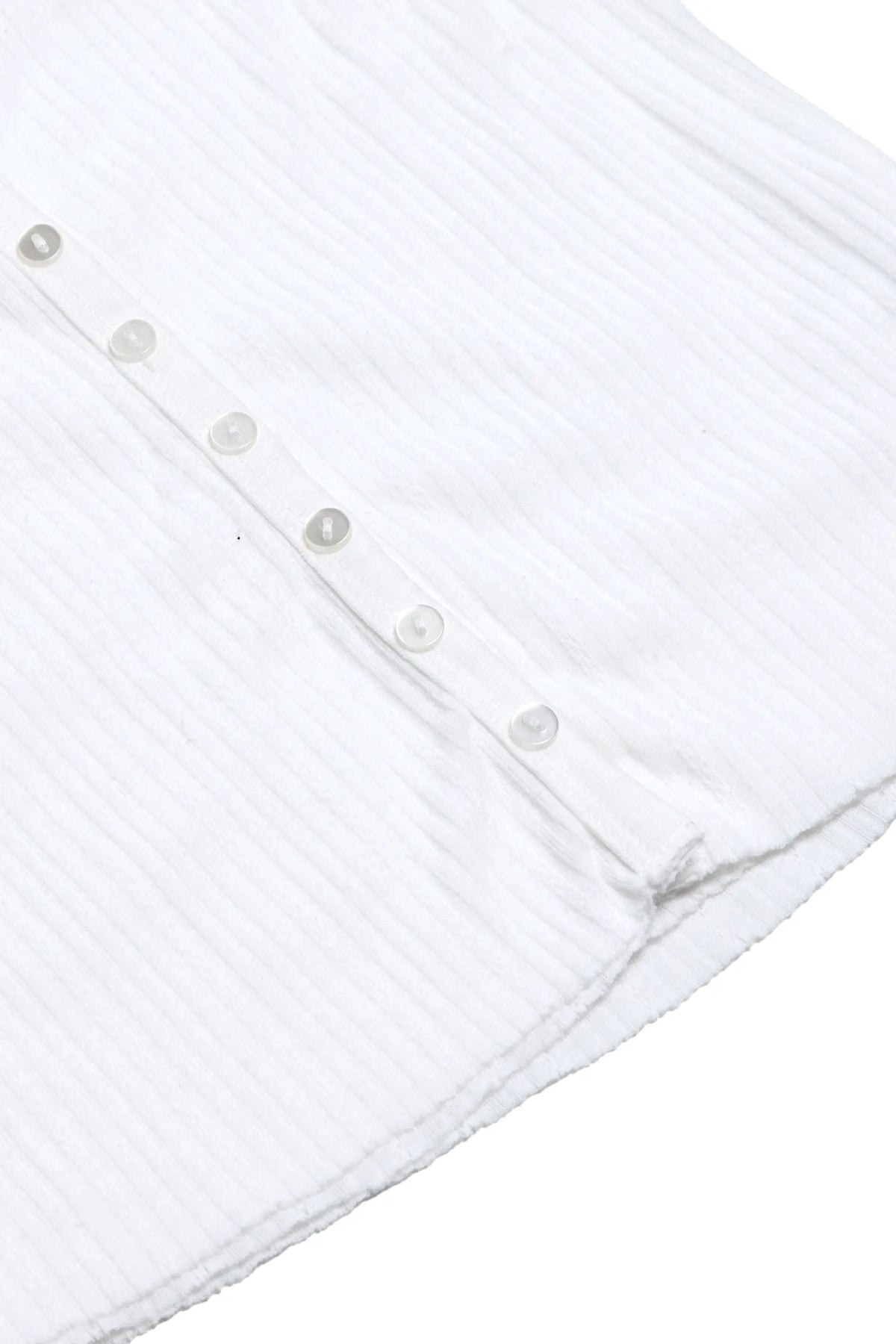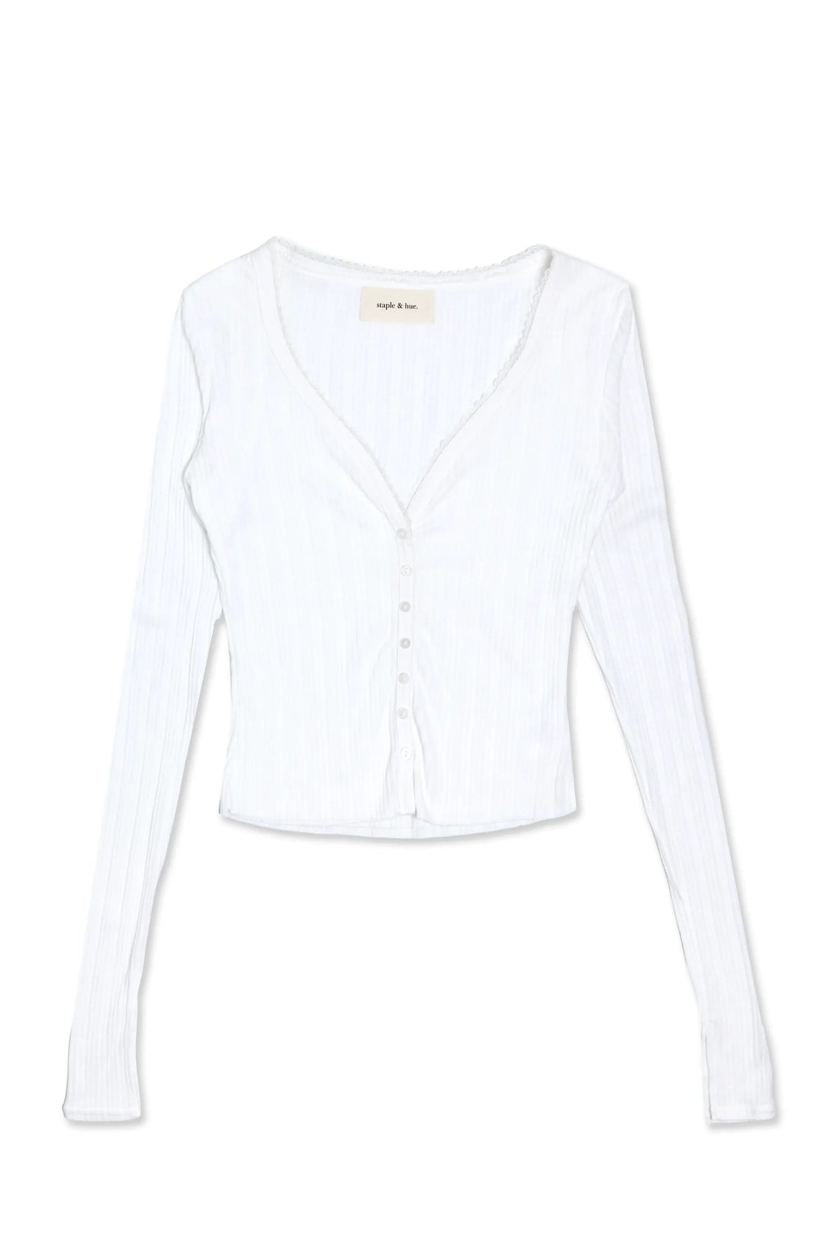Soft double-layered knit cardigan featuring a subtle pointelle texture and delicate lace trim along the neckline. Designed with a deep V front, tonal fixed buttons, and a close-fitting silhouette that skims the body.